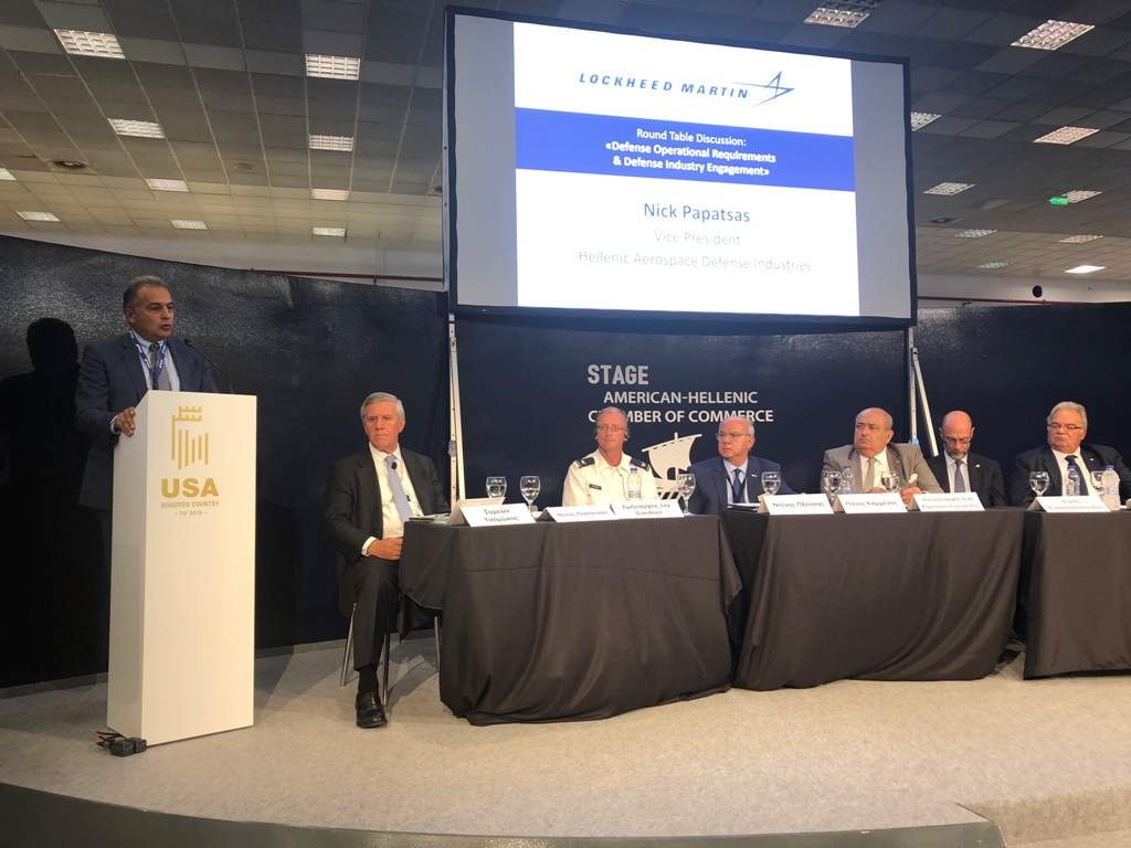 Ο κ. Νίκος Παπάτσας, Αντιπρόεδρος της Ένωσης Ελληνικών Εταιρειών Αεροδιαστημικής & Άμυνας (ΕΕΛΕΑΑ) και Διευ/νων Σύμβουλος της EFA Ventures, κατά την ομιλία του στη συζήτηση της Lockheed Martin