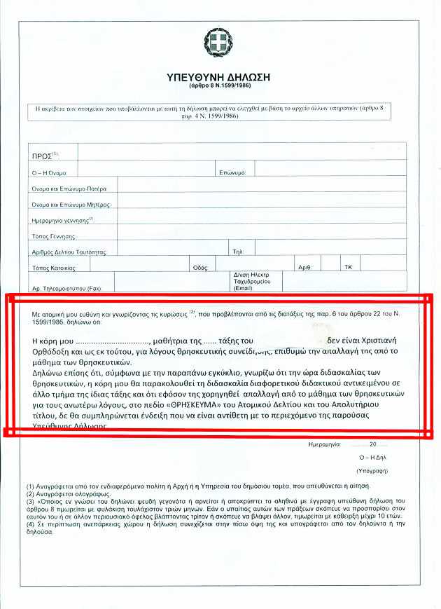 Για τη διαπίστωση αυτή, αρκεί μια ματιά στα έντυπα που υποχρεούνται να συμπληρώσουν οι γονείς των μαθητών που επιθυμούν να εξαιρεθούν από το επίμαχο μάθημα.