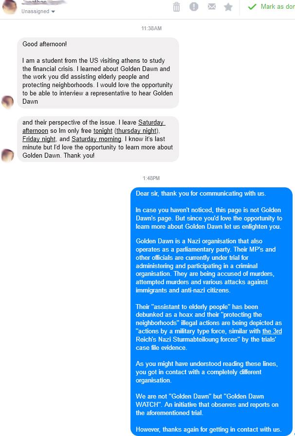 «Θα ήθελα να πάρω συνέντευξη από εκπρόσωπο της Χρυσής Αυγής», ανέφερε μεταξύ άλλων στο μήνυμά του ο φοιτητής από τις ΗΠΑ, για να λάβει «πληρωμένη» απάντηση από τους διαχειριστές της σελίδας.