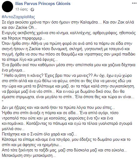 Με ένα μακροσκελές κείμενο στην προσωπική του σελίδα στο facebook ο συγκάτοικος του Ζακ Κωστόπουλου, του 33χρονου που έχασε τη ζωή του στο κοσμηματοπωλείο της Ομόνοιας, αποχαιρετά τον καλό του φίλο, μιλώντας τόσο για τις στιγμές που είχαν ζήσει μαζί όσο και για την προσπάθεια του Ζακ -τον τελευταίο καιρό- να ζήσει καλύτερα. Χαρακτηρίζοντας άδικο τον τρόπο που έφυγε, ο φίλος του υπόσχεται στον Ζακ ότι θα αποδοθεί δικαιοσύνη…