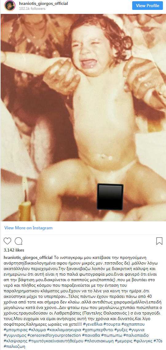 «Το ινσταγκραμ μου κατέβασε την προηγούμενη ανάρτηση (δικαιολογημένα αφού ήμουν μικρός μεν, τσίτσιδος δε) ,μάλλον λόγω ακατάλληλου περιεχομένου. Την ξανανεβάζω λοιπόν με διακριτική κάλυψη και ενημερώνω ότι αυτή είναι η πιο παλιά φωτογραφία μου. Είναι φανερό ότι είναι απ την βάφτιση μου, διακρίνεται ο παππούς μου (παππάς) ,που με βουτάει στο νερό και πλήθος κόσμου που παραξενεύεται με την ένταση του παραληρηματικού κλάματος μου.