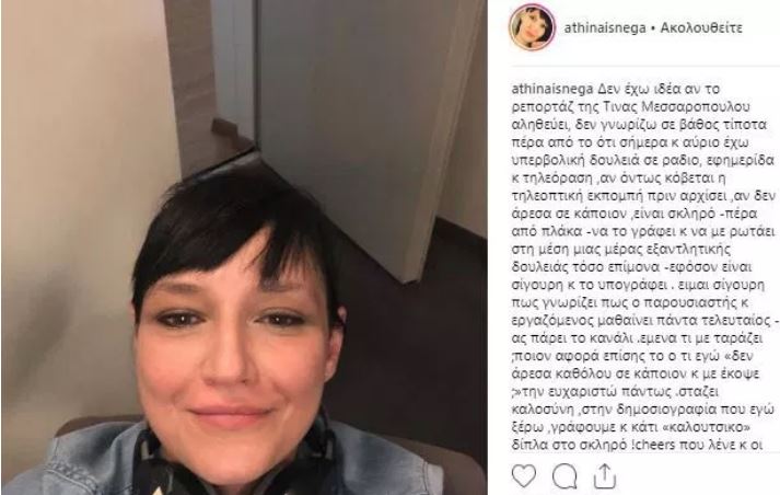 «Δεν έχω ιδέα αν το ρεπορτάζ της Τινας Μεσσαροπουλου αληθεύει, δεν γνωρίζω σε βάθος τίποτα πέρα από το ότι σήμερα κ αύριο έχω υπερβολική δουλειά σε ράδιο, εφημερίδα κ τηλεόραση ,αν όντως κόβεται η τηλεοπτική εκπομπή πριν αρχίσει ,αν δεν άρεσα σε κάποιον ,είναι σκληρό -πέρα από πλάκα -να το γράφει κ να με ρωτάει στη μέση μιας μέρας εξαντλητικής δουλειάς τόσο επίμονα -εφόσον είναι σίγουρη κ το υπογράφει . Είμαι σίγουρη πως γνωρίζει πως ο παρουσιαστής κ εργαζόμενος μαθαίνει πάντα τελευταίος -ας πάρει το κανάλι εμένα τι με ταράζει ;ποιον αφορά επίσης το ο τι εγώ «δεν άρεσα καθόλου σε κάποιον κ με έκοψε ;»την ευχαριστώ πάντως στάζει καλοσύνη ,στην δημοσιογραφία που εγώ ξέρω ,γράφουμε κ κάτι «καλούτσικο» δίπλα στο σκληρό !cheers που λένε κ οι Άγγλοι» έγραψε εμφανώς δυσαρεστημένη.