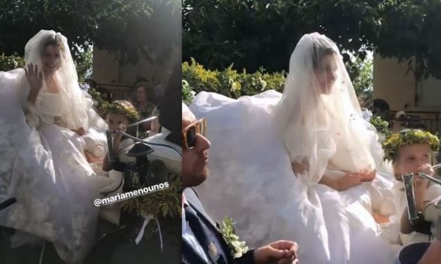 Η Μαρία Μενούνος έφθασε με μια ώρα καθυστέρηση στην εκκλησία, κατά τις 17.00 το απόγευμα, ενώ ο γάμος ήταν προγραμματισμένος στις 16.00. Φόρεσε ένα εντυπωσιακό φλοράλ νυφικό δια χειρός Σήλιας Κριθαριώτη.