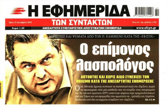 Δεν είχε το θάρρος να καταγγείλει ευθέως την «Εφ.Συν.» ότι χρηματοδοτείται από τον Σόρος ή ότι πήρε δάνειο από τράπεζα χωρίς ή με εγγυήσεις. Αυτός είναι ο κ. Καμμένος. Εχει την άνεση να συκοφαντεί, αλλά είναι ανίκανος να στοιχειοθετήσει οτιδήποτε.