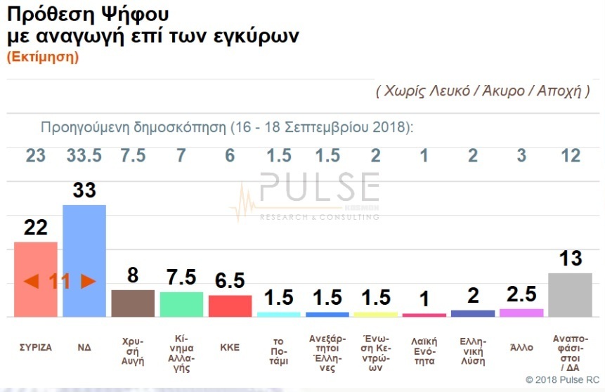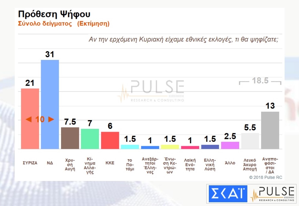 Στις δέκα ποσοστιαίες μονάδες -έντεκα με αναγωγή επί των εγκύρων- διαμορφώνεται η διαφορά υπέρ της ΝΔ έναντι του ΣΥΡΙΖΑ σύμφωνα με τη νέα δημοσκόπηση της εταιρείας Pulse για λογαριασμό του ΣΚΑΪ.