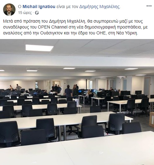 Ο Μιχάλης Ιγνατίου σημείωσε στον προσωπικό του λογαριασμό στο facebook: «Μετά από πρόταση του Δημήτρη Μιχαλέλη, θα συμπορευτώ μαζί με τους συναδέλφους του OPEN Channel στη νέα δημοσιογραφική προσπάθεια, με αναλύσεις από την Ουάσιγκτον και την έδρα του ΟΗΕ, στη Νέα Υόρκη».