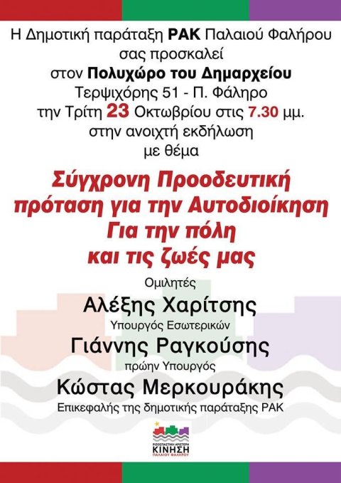 Την εκδήλωση διοργανώνει η Ριζοσπαστική Αριστερή Κίνηση (ΡΑΚ) Παλαιού Φαλήρου, η οποία είναι δημοτική κίνηση της περιοχής που πρόσκειται στον ΣΥΡΙΖΑ. Πέραν του Γιάννη Ραγκούση θα μιλήσει ο Υπουργός Εσωτερικών Αλέξης Χαρίτσης και ο επικεφαλής της δημοτικής παράταξης ΡΑΚ Κώστας Μερκουράκης.