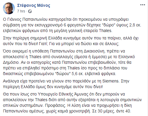 Παράλληλα, όμως, ο κ. Μάνος επισημαίνει ότι, παρότι διώκεται ο κ. Παπαντωνίου για νομιμοποίηση εσόδων από παράνομη δραστηριότητα, η εταιρεία που του έδωσε τα χρήματα παραμένει ακαταδίωκτη.