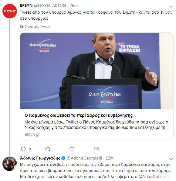 Συγκεκριμένα, ο κ. Γεωργιάδης έγραψε: «Με συγχωρείτε, ανεβάζετε ουδέτερα την είδηση περί Καμμένου και Σόρος όταν πριν από μία εβδομάδα σας κατηγορούσε εσάς ότι τα πήρατε από τον Σόρος;;; Μα δεν έχετε πλέον καθόλου αξιοπρέπεια; Δηλ λέει ψέματα ο @NikosKotzias;».
