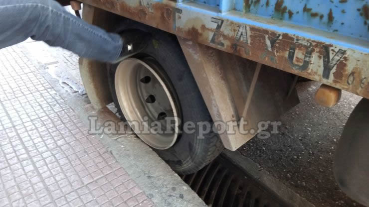Συγκεκριμένα φορτηγό επιχειρούσε να ανεβεί σε πεζοδρόμιο μπροστά σε επιχείρηση όπου θα ξεφόρτωνε τσουβάλια με προϊόντα και χρησιμοποίησε σιδερένιο πέδιλο (τάκο) για τη στήριξη του πίσω λάστιχου.