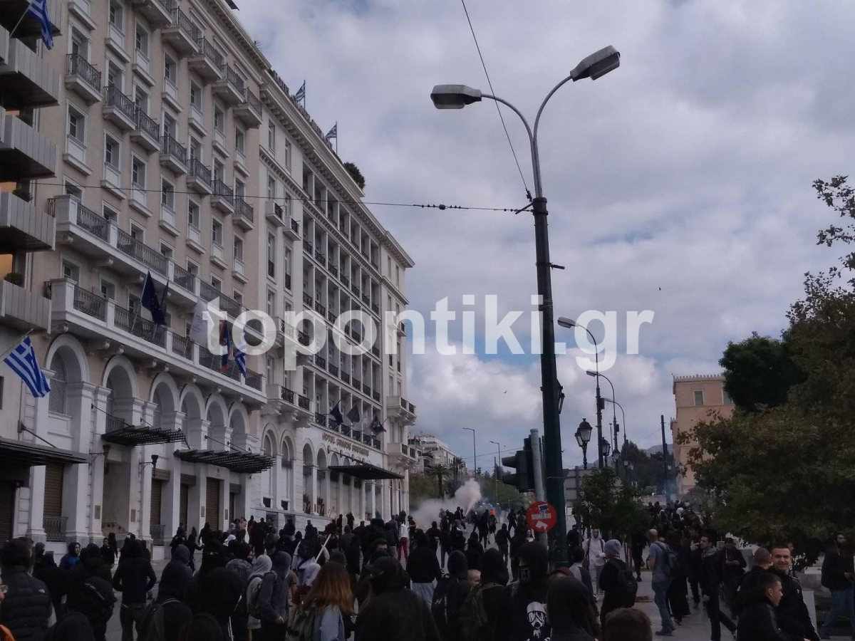 Ένταση επικράτησε όταν, καθώς η διαδήλωση εισερχόταν στην πλατεία Συντάγματος, ομάδα ατόμων με καλυμμένα χαρακτηριστικά αποκόπηκε από το κυρίως σώμα της πορείας και επιτέθηκε στις δυνάμεις των ΜΑΤ που βρίσκονταν μπροστά στη Βουλή, στη συμβολή των οδών βασιλίσσης Αμαλίας και βασιλίσσης Σοφίας, εκτοξεύοντας αντικείμενα, με την αστυνομία να απαντά κάνοντας χρήση χημικών.