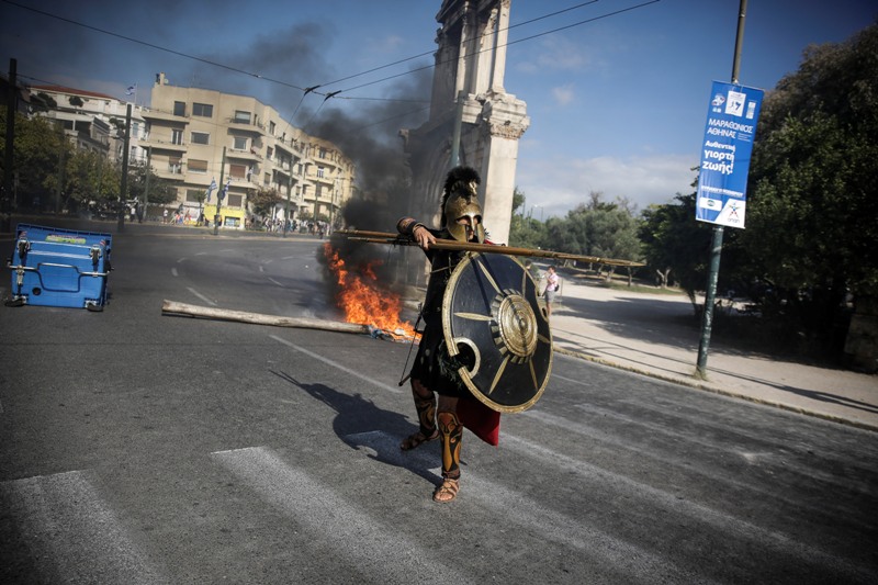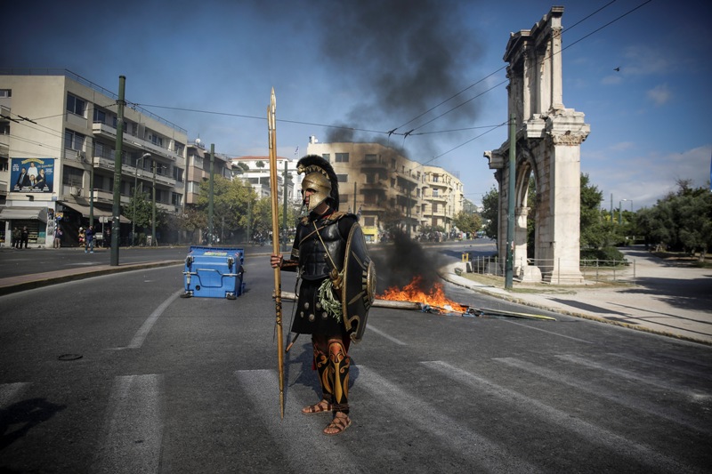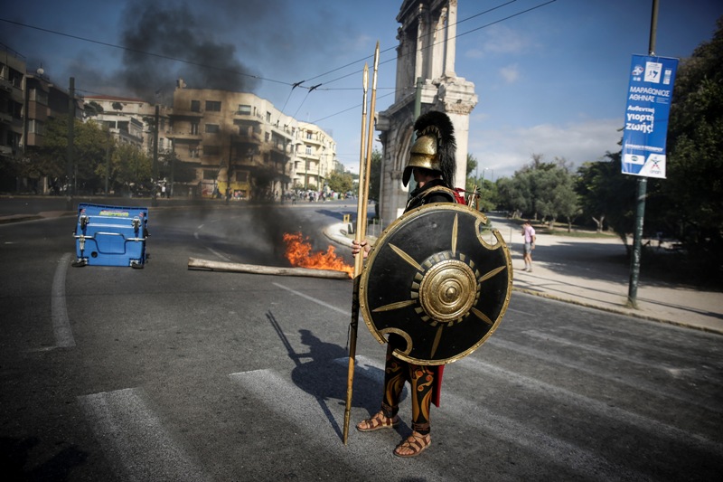 Ένας άγνωστος, ντυμένος από την κορφή ως τα νύχια με στολή που παρέπεμπε στην αρχαία Ελλάδα -με κράνος, ασπίδα και δόρυ, διπλό, μάλιστα…- έκανε την εμφάνισή του στη βασιλίσσης Όλγας την ώρα που σε εξέλιξη βρίσκονταν τα επεισόδια μεταξύ διαδηλωτών και αστυνομίας.