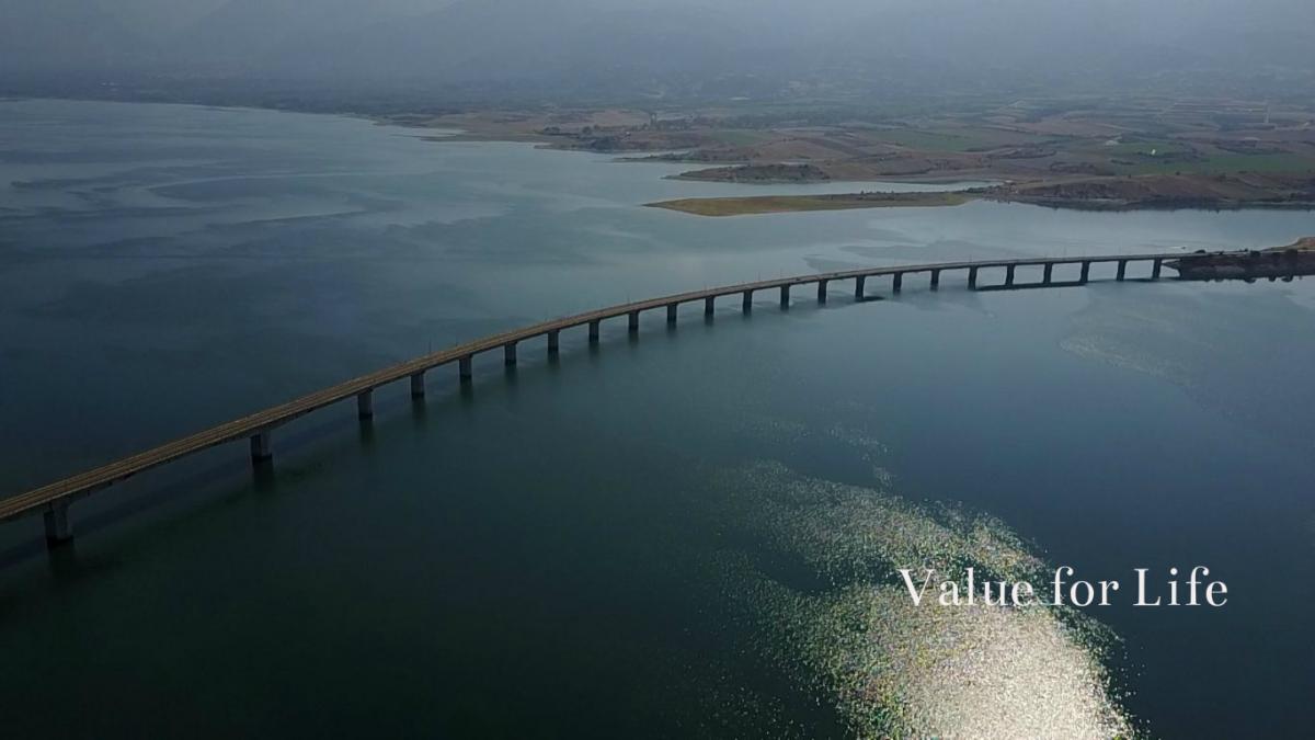Εντυπωσιάζει για το μεγάλο μήκος της καθώς περνά πάνω από μια «νέα» λίμνη της βόρειας Ελλάδας που δημιουργήθηκε το 1972 και στον βυθό της κρύβει ένα χαμένο χωριό. Την παλιά Νεραϊδα.