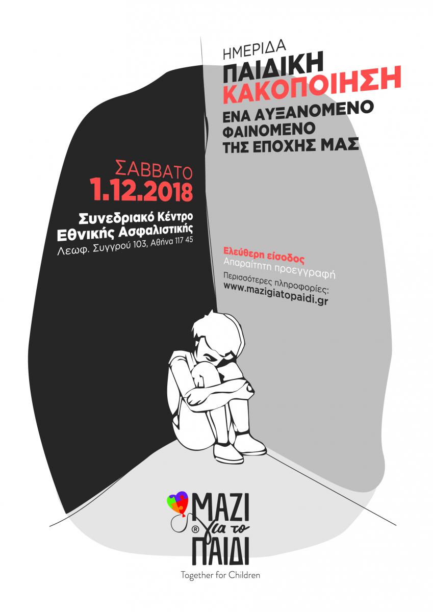 Η Ένωση «Μαζί για το Παιδί» διοργανώνει ημερίδα με θέμα «Παιδική Κακοποίηση: Ένα αυξανόμενο φαινόμενο της εποχής μας» το Σάββατο 1 Δεκεμβρίου στο Συνεδριακό Κέντρο της Εθνικής Ασφαλιστικής (Λεωφ. Συγγρού 103), 9.00 έως 15.00 με ελεύθερη είσοδο.