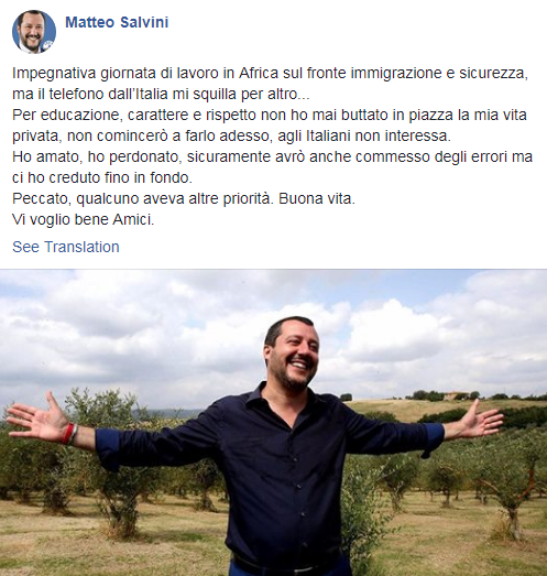Έτσι ο Σαλβίνι έγραψε: «Λόγω χαρακτήρος, αγωγής και σεβασμού δεν δημοσιοποίησα ποτέ την προσωπική μου ζωή. Δεν θα αρχίσω να το κάνω τώρα, τους Ιταλούς δεν τους ενδιαφέρει. Αγάπησα, συγχώρεσα, έκανα σίγουρα και λάθη αλλά πίστευα πάντα σε αυτό που έκανα. Κρίμα, κάποιος είχε άλλες προτεραιότητες. Καλή συνέχεια».