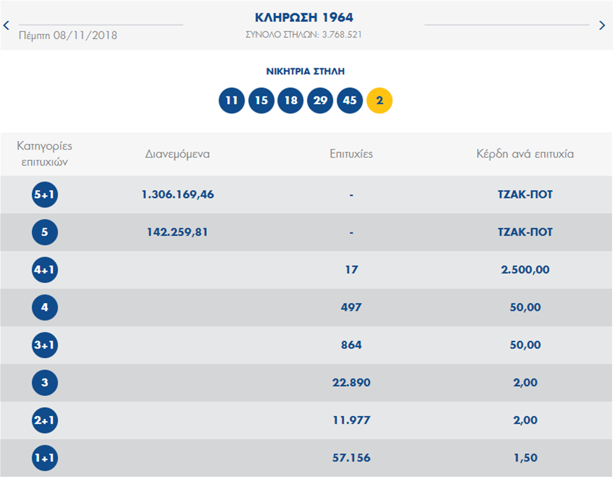 Οι αριθμοί που κληρώθηκαν είναι οι εξής: 11, 15, 18, 29 και 45. Τζόκερ κληρώθηκε ο αριθμός 2.