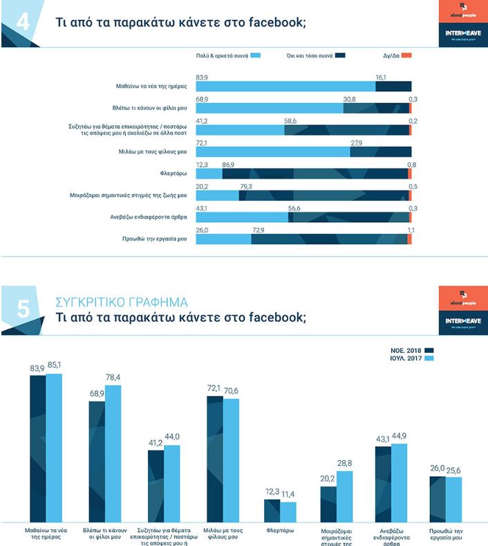 Σε σχέση με το τι κάνουν οι χρήστες όταν συνδέονται στο Facebook, οι περισσότεροι ενημερώνονται για τα νέα της ημέρας, ενώ ελάχιστα παραδέχτηκαν ότι φλερτάρουν.