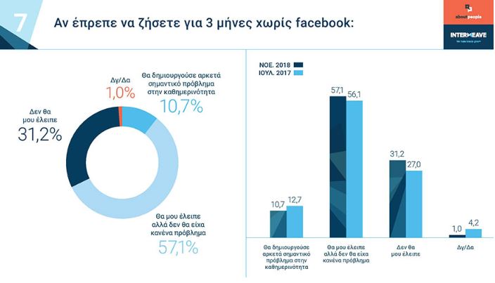 Σε ερώτηση για το πώς θα ένιωθε κάποιος αν έπρεπε να ζήσει για 3 μήνες στο Facebook, το 10,7% είπε ότι θα του δημιουργούσε πρόβλημα στην καθημερινότητά του.