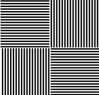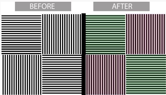 Για να πετύχει η οφθαλμαπάτη, πρέπει να κοιτάζετε τις παρακάτω εικόνες με κάθετες και οριζόντιες γραμμές, για αρκετή ώρα μέχρι τελικά να αρχίσετε να βλέπετε το μαύρο και το άσπρο, ως πράσινο και κόκκινο.