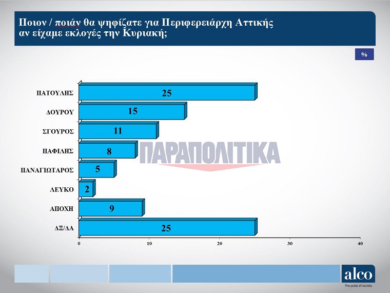 Στη μέτρηση που πραγματοποιήθηκε από την εταιρεία ALCO για την Περιφέρεια Αττικής, στην πρόθεση ψήφου ο Γιώργος Πατούλης συγκεντρώνει ποσοστό 25% έναντι 15% της Ρένας Δούρου και 11% του Γιάννη Σγουρού. Ακολουθούν ο Θανάσης Παφίλης με 8% και ο Ηλίας Παναγιώταρος με 5%. Το Λευκό συγκεντρώνει 2%, Αποχή δηλώνει το 9% ενώ ΔΞ/ΔΑ απαντά το 25%.