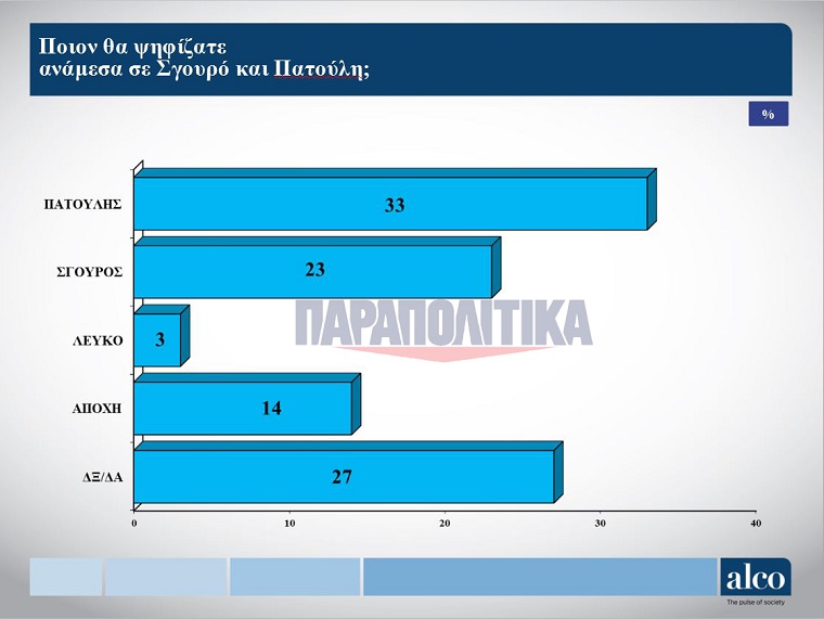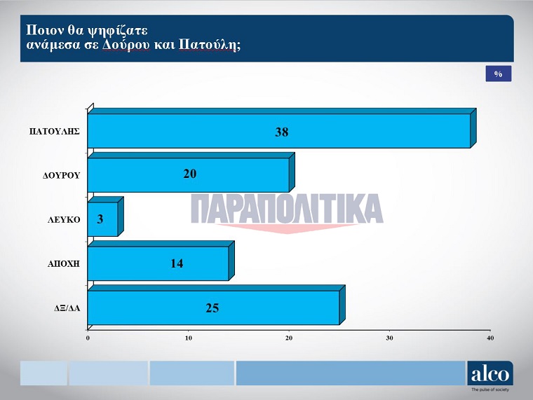 Στο ερώτημα «Ποιον θα ψηφίζατε ανάμεσα σε Πατούλη και Δούρου», το 38% επιλέγει τον κ. Πατούλη έναντι της κ. Δούρου που συγκεντρώνει 20%. Σε αντίστοιχο ερώτημα «Ποιον θα ψηφίζατε ανάμεσα σε Πατούλη και Δούρου», ο πρώτος συγκεντρώνει 33% έναντι 23% του δεύτερου.