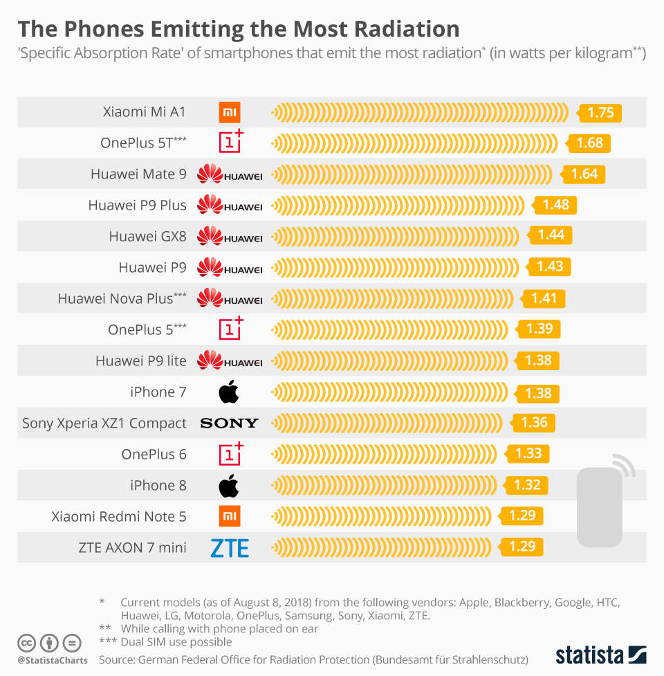 Βάσει αυτών των δεδομένων το Statista σχεδίασε το infographic που ακολουθεί παρουσιάζοντας τα κινητά τηλέφωνα που εκπέμπουν την μεγαλύτερη ακτινοβολία τη στιγμή που τα ακουμπάμε στο αυτί μας για να μιλήσουμε.
