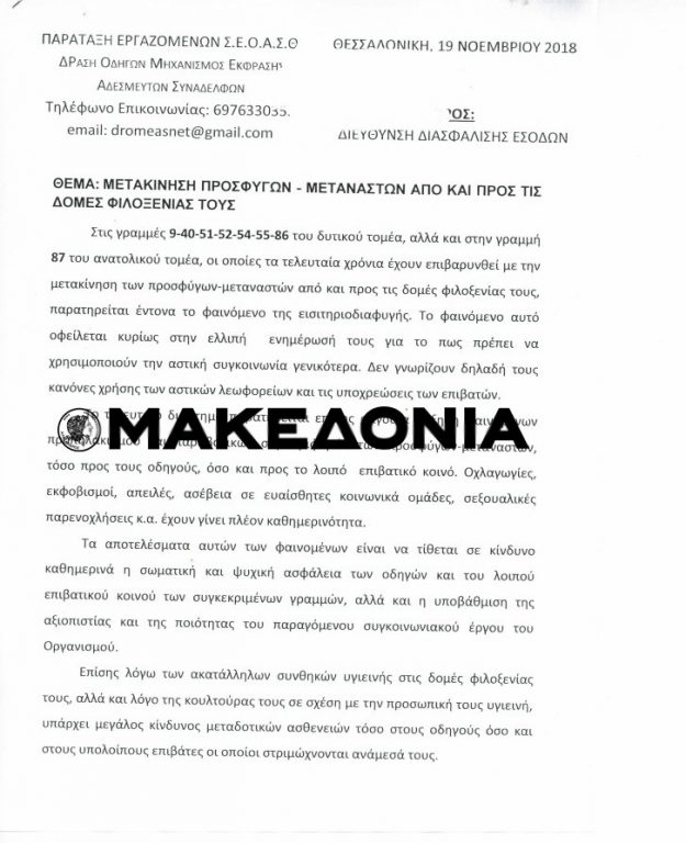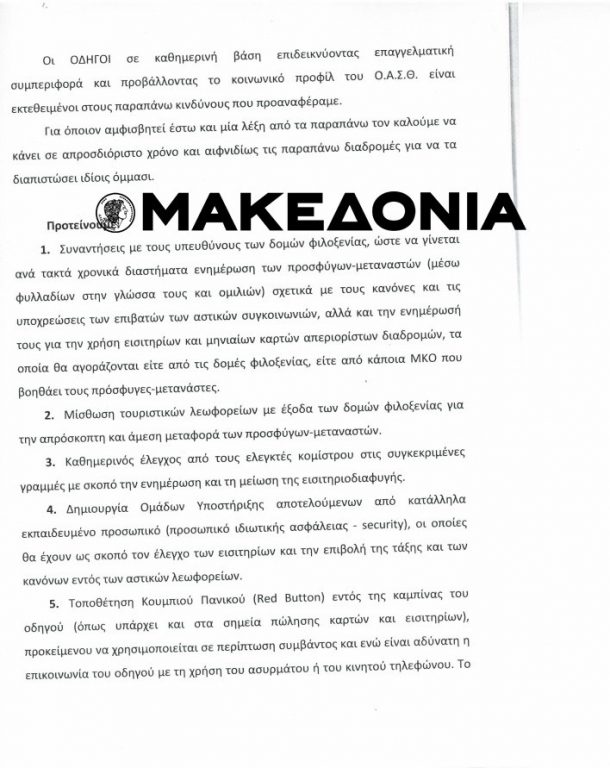 Κι αυτό, αποδεικνύεται και από το συγκεκριμένο έγγραφο, το οποίο έστειλαν στην διοίκηση του ΟΑΣΘ ζητώντας τους μεταξύ άλλων να βάλουν panic button στα συγκεκριμένα λεωφορεία, να εμβολιάζονται συχνά και να τους παίρνουν αίμα για να δουν πως δεν κόλλησαν κάτι από τους πρόσφυγες!