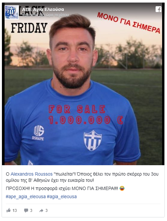 Συγκεκριμένα, η ΑΠΕ Αγία Ελεούσα μέσω της επίσημης σελίδας της, στο Facebook ανακοίνωσε πως μόνο για σήμερα, πωλείται για μόλις… 1 εκατ. ευρώ, ο πρώτος σκόρερ της ομάδας στη Β’ Αθηνών, Αλέξανδρος Ρούσσος!