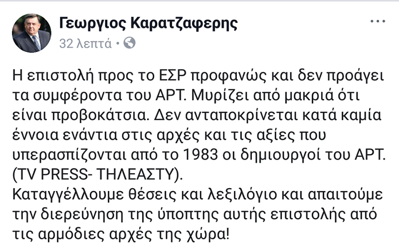 Με ανάρτησή του στα social media, ο πρόεδρος του ΛΑΟΣ και ιδιοκτήτης του ΑΡΤ Γιώργος Καρατζαφέρης σχολίασε δηκτικά την επίμαχη απειλητική επιστολή που εστάλη στο ΕΣΡ μετά το πρόστιμο που επιβλήθηκε στο κανάλι.