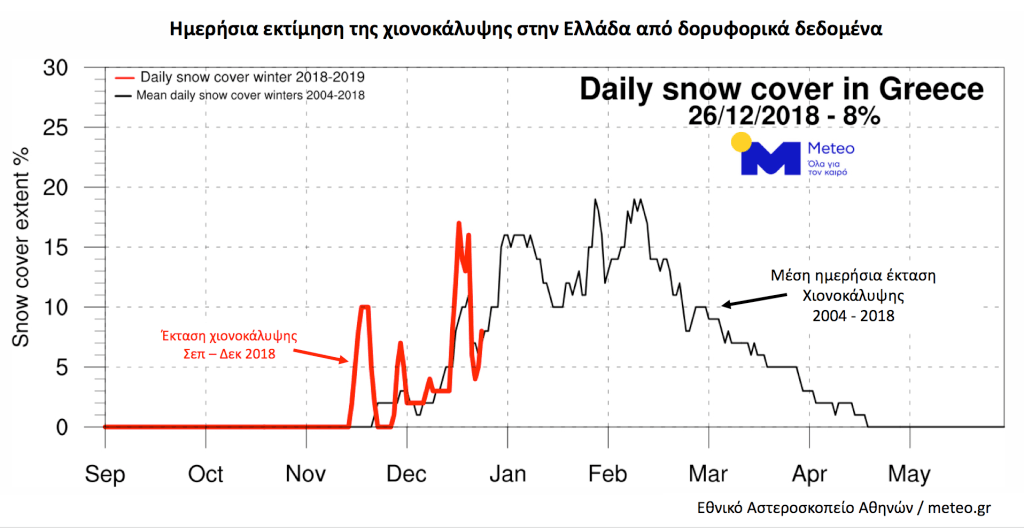 Η έκταση αυτή της χιονοκάλυψης βρίσκεται κοντά τον μέσο όρο των τελευταίων 14 ετών, σύμφωνα με την μετεωρολογική υπηρεσία meteo του Εθνικού Αστεροσκοπείου Αθηνών (ΕΑΑ).