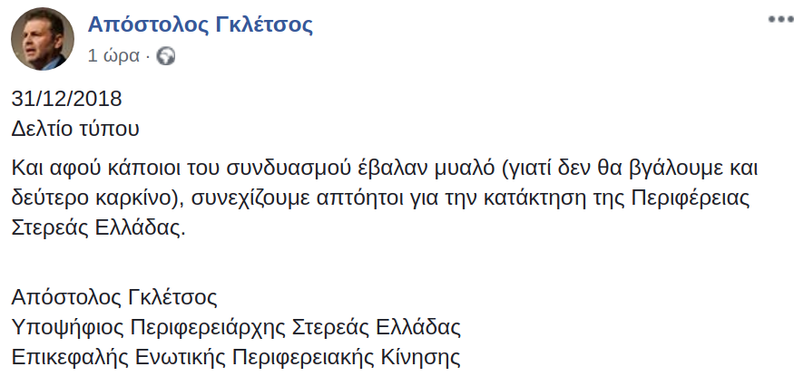 Με αιχμές προς συνεργάτες του, ο νυν δήμαρχος Στυλίδας σημειώνει ότι «συνεχίζουμε απτόητοι για την κατάκτηση της περιφέρειας Στερεάς Ελλάδας».