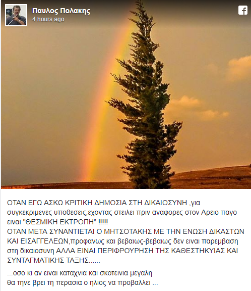Με μια άκρως επιθετική ανάρτηση στον προσωπικό του λογαριασμό στο Facebook, ο αναπληρωτής υπουργός Υγείας Παύλος Πολάκης σχολίασε τη χθεσινή συνάντηση του προέδρου της ΝΔ Κυριάκου Μητσοτάκη με το προεδρείο της Ένωσης Δικαστών και Εισαγγελέων, αφήνοντας αιχμές και για τη στάση του κόσμου της Δικαιοσύνης.