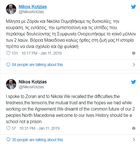 Με ανάρτησή του στο Twitter, αναφέρεται στον “Ζόραν και τον Νικόλα“, εννοώντας τους Ζάεφ και Ντιμιτρόφ, με τους οποίους και διαπραγματεύονταν επί μήνες για τη Συμφωνία των Πρεσπών.