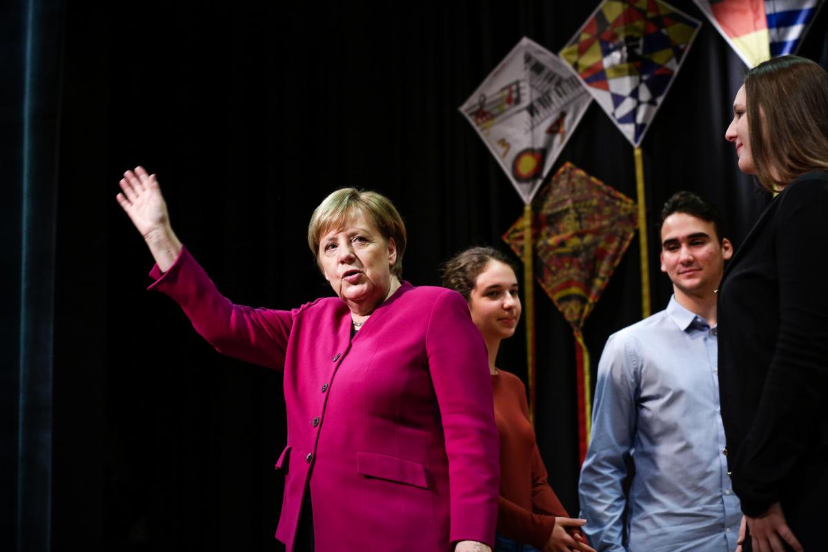 Αφού είχε έναν σύντομο διάλογο με καθηγητές και μαθητές στους διαδρόμους της Γετμανικης Σχολής η κυρία Μέρκελ κατευθύνθηκε στο αμφιθέατρο όπου συζήτησε με μαθητές της Γ’ Λυκείου για το μέλλον της Ευρωπαϊκής Ένωσης, την οικονομία αλλά και τους κινδύνους του εθνικισμού και του λαϊκισμού με τους οποίους έχουν τεθεί αντιμέτωποι πολλοί ευρωπαϊκοί λαοί, ιδίως τα τελευταία χρόνια.