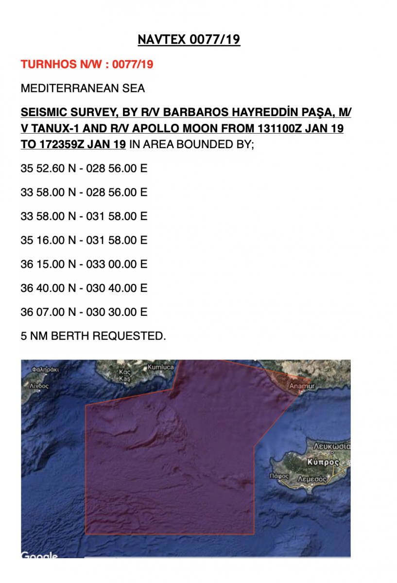 Μόλις ανακοινώθηκε η αλλαγή στο ΥΠΕΘΑ και στο πλαίσιο απάντησης στην επιλογή του πρωθυπουργού να κάνει υπουργό τον νυν Α/ΓΕΕΘΑ Βαγγέλη Αποστολάκη, οι Τούρκοι δέσμευσαν περιοχή για έρευνες από το BARBAROS που ξεκινά από τώρα έως τις 17/1.