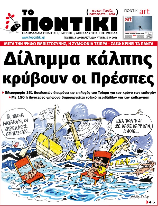 Με πρωτοσέλιδο τίτλο «Δίλημμα κάλπης κρύβουν οι Πρέσπες» και αναλυτικό-αποκαλυπτικό ρεπορτάζ για πώς, μετά την ψήφο εμπιστοσύνης, η συμφωνία Τσίπρα-Ζάεφ κρίνει τα πάντα, κυκλοφορεί το «ΠΟΝΤΙΚΙ» το πρωί της Πέμπτης.