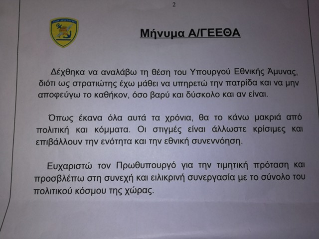 Συνεργάτες του υπουργού ανέφεραν στο «Ποντίκι», ότι ο ίδιος πριν αποστρατευτεί και αναλάβει τα νέα του καθήκοντα, είχε, με δήλωσή του, δώσει το στίγμα της «θητείας» του ως πολιτικός προϊστάμενος, ξεκαθαρίζοτνας ότι δέχτηκε να αναλάβει τη θέση του υπουργού Άμυνας, διότι έμαθε να υπηρετεί την πατρίδα και να μην αποφεύγει το καθήκον όσο βαρύ και αν είναι.