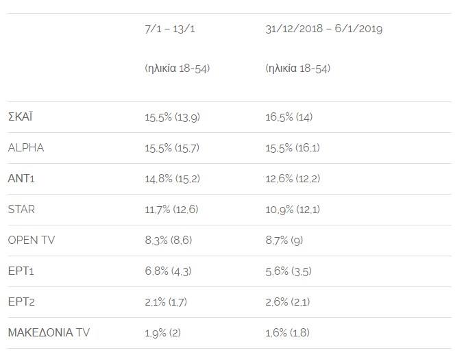 Ο ΣΚΑΪ κατέγραψε πτώση και ισοβάθμησε στην πρώτη θέση με τον Alpha, ενώ ο ΑΝΤ1 αύξησε πάνω από 2 μονάδες το ποσοστό του.