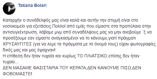 Συγκεκριμένα, η φωτορεπόρτερ έγραψε στο Facebook: «Καταρχήν ο συνάδελφός μας είναι καλά και αυτήν την στιγμή είναι στο νοσοκομείο για εξετάσεις. Πολλοί από εμάς που είμαστε στα προπύλαια στην αντισυγκέντρωση, λάβαμε μήνυμα από συναδέλφους μας να μην ανεβούμε ή να προσέξουμε εαν είμαστε αναγκασμένοι να το κάνουμε,γιατί πράγματι ΧΡΥΣΑΥΓΙΤΕΣ (για να λεμε τα πράγματα με το όνομά τους) είχαν φωτογραφίες δικές μας και μας έψαχναν!