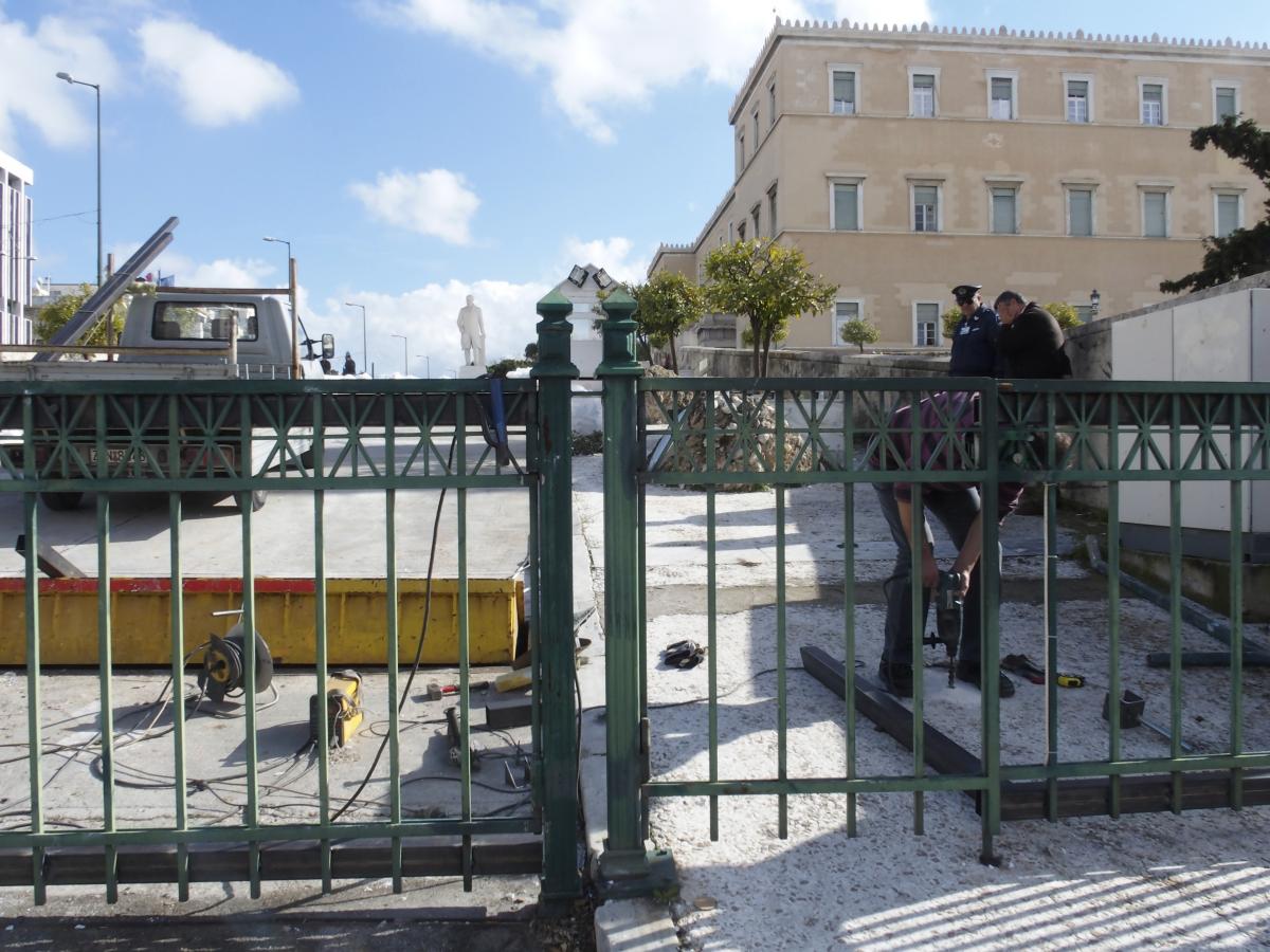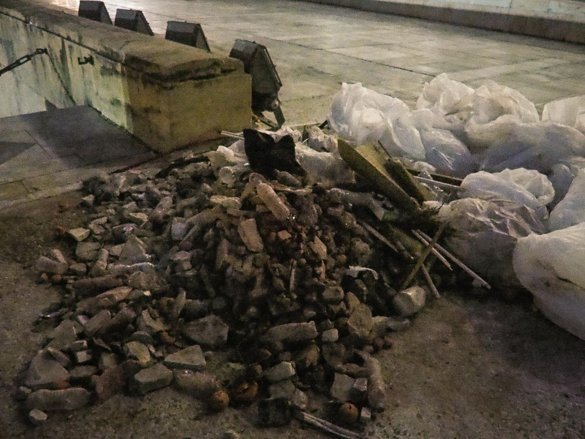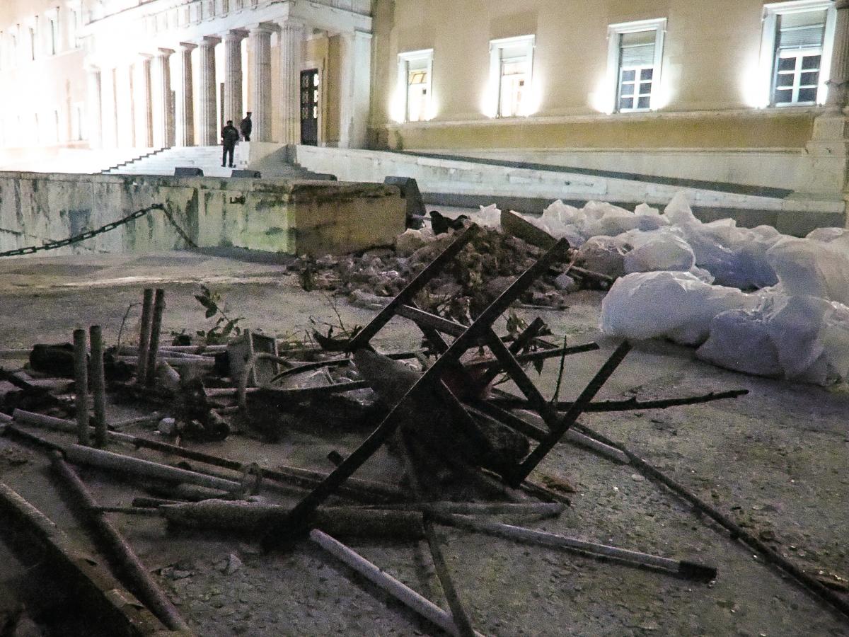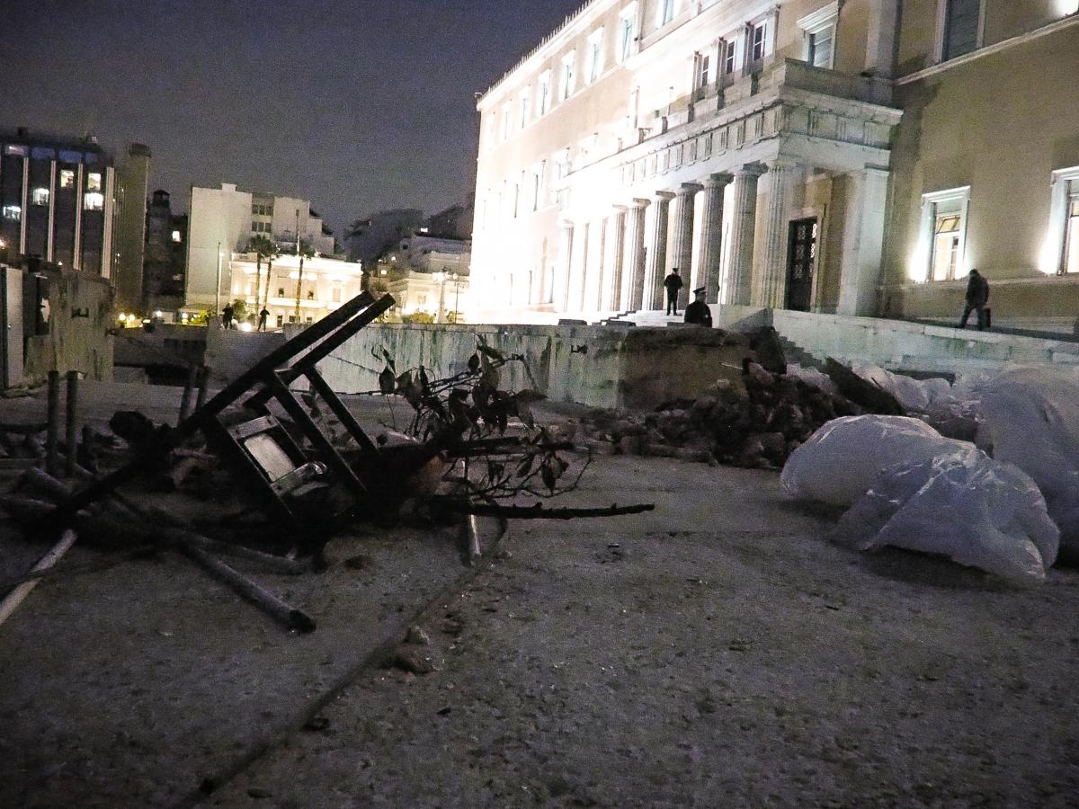 Με βομβαρδισμένο τοπίο μοιάζει ο προαύλιος χώρος της Βουλής, όπου το μεσημέρι της Παρασκευής ακροδεξιοί διαδηλωτές συγκρούστηκαν με τα ΜΑΤ.