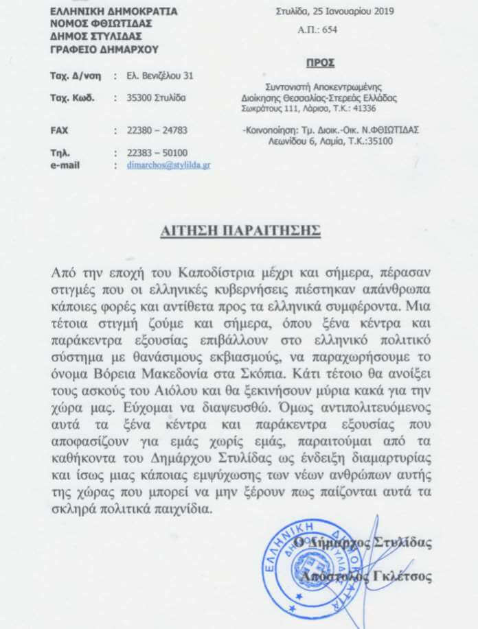 «Από την εποχή του Καποδίστρια μέχρι και σήμερα, πέρασαν στιγμές που οι ελληνικές κυβερνήσεις πιέστηκαν απάνθρωπα κάποιες φορές και αντίθετα προς τα ελληνικά συμφέροντα. Μια τέτοια στιγμή ζούμε και σήμερα, όπου ξένα κέντρα και παράκεντρα εξουσίας επιβάλλουν στο ελληνικό πολιτικό σύστημα με θανάσιμους εκβιασμούς, να παραχωρήσουμε το όνομα Βόρεια Μακεδονία στα Σκόπια. Κάτι τέτοιο θα ανοίξει τους ασκούς του Αιόλου και θα ξεκινήσουν μύρια κακά για την χώρα μας. Εύχομαι να διαψευσθώ. Όμως αντιπολιτευόμενος αυτά τα ξένα κέντρα και παράκεντρα εξουσίας που αποφασίζουν για εμάς χωρίς εμάς, παραιτούμαι από τα καθήκοντα του Δημάρχου Στυλίδας ως ένδειξη διαμαρτυρίας και ίσως μιας εμψύχωσης των νέων ανθρώπων αυτής της χώρας που μπορεί να μην ξέρουν πως παίζονται αυτά τα σκληρά πολιτικά παιχνίδια.»