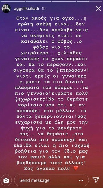 «Τέλος καλό!. Όταν ακούς για όγκο, η πρώτη σκέψη είναι… δεν είναι, δεν προλαβαίνεις να σκεφτείς γιατί σε καταβάλει ο φόβος για το χειρότερο. Χιλιάδες γυναίκες το έχουν περάσει και θα το περάσουν και σίγουρα θα το ξαναπεράσουν. Γιατί εμείς οι γυναίκες είμαστε τα πιο δυνατά πλάσματα του κόσμου, τα πιο γενναία. Είμαστε πολύ ξεχωριστές! Να το θυμάστε κορίτσια μου ότι κι αν προκύψει στο μέλλον, τα πάντα ξεπερνιούνται! Σας ευχαριστώ με όλη μου την ψυχή για τα μηνύματά σας. Να θυμάστε στα δύσκολα μια προσευχή και ελπίδα είναι η πιο ισχυρή βοήθεια για τον ίδιο μας τον εαυτό αλλά και για να βοηθήσουμε τους άλλους. Σας αγαπώ πολύ», έγραψε χαρακτηριστικά.