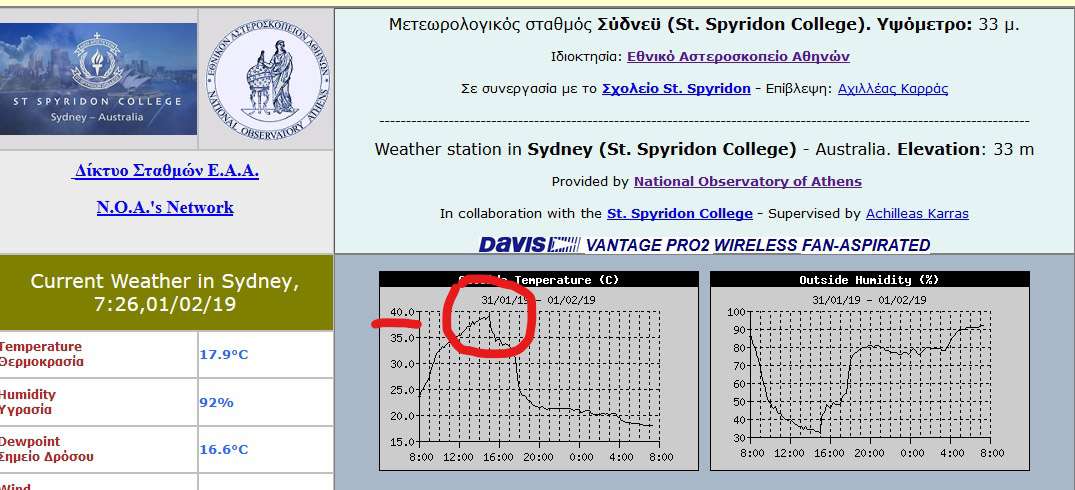 Και ενώ σε πολλές βόρειες πολιτείες των ΗΠΑ το θερμόμετρο έχει πέσει δεκάδες βαθμούς Κελσίου κάτω από το μηδέν, στην Αυστραλία ο υδράργυρος σκαρφάλωσε στους 45°C, με τον μετεωρολογικό σταθμό του Εθνικού Αστεροσκοπείου/meteo.gr στο Σίδνεϊ (St. Spyridon College) να καταγράφει 39.2°C, την υψηλότερη τιμή μέχρι στιγμής για το καλοκαίρι του Νοτίου Ημισφαιρίου.