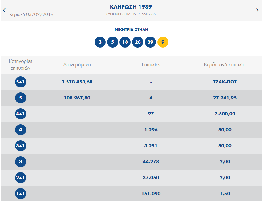ΟΙ τυχεροί αριθμοί που κληρώθηκαν ήταν οι 3, 5, 18, 28 και 39.