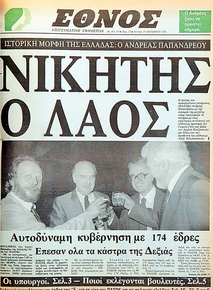 Από το 13,58% των ψήφων το Νοέμβριο του 1974, το ποσοστό του ΠΑΣΟΚ θα εκτιναχθεί στο 48,1% τον Οκτώβριο του 1981. Ούτε ο Κωνσταντίνος Καραμανλής από τα δεξιά, αλλά ούτε και ο Χαρίλαος Φλωράκης από τα αριστερά μπόρεσαν να αντιπαρατεθούν αποτελεσματικά στον Ανδρέα Παπανδρέου.