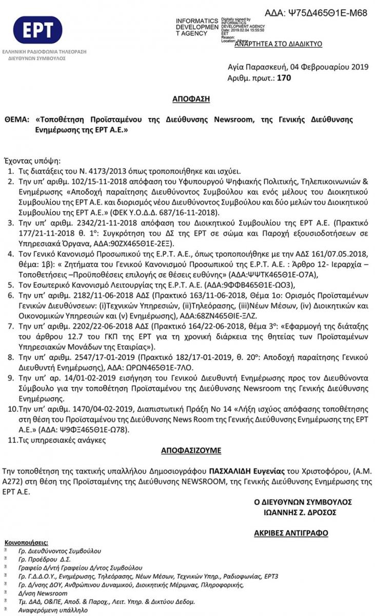 Με ανάρτηση στη «Διαύγεια» και χωρίς να έχει προηγηθεί σχετική ανακοίνωση, η ΕΡΤ γνωστοποίησε πως η άλλοτε παρουσιάστρια του δελτίου καιρού στον ΑΝΤ1 και Μις Ελλάς 1992, αναλαμβάνει τη διεύθυνση ειδήσεων (εδώ η σχετική ανάρτηση «Τοποθέτηση Προϊσταμένου της Διεύθυνσης Newsroom, της Γενικής Διεύθυνσης Ενημέρωσης της ΕΡΤ Α.Ε.»), αναβαθμίζοντάς την, καθώς βρίσκονταν ήδη στον ενημερωτικό τομέα.