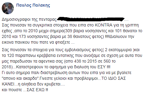 Συγκεκριμένα, ο κ. Πολάκης με ανάρτησή του στο Facebook σχολιάσε τα ρεπορτάζ: «Σας πονεσαν τα συγκριτικα στοιχεια που ειπα στο KONTRA για τη γριππη εχθες ,απο το 2010 μεχρι σημερα(309 βαρια νοσησαντες και 101 θανατοι το 2010 και 173 νοσησαντες βαρια με 38 θανατους φετος) !!!!Διαλυουν την εικονα πανικου που πατε να φτιαξετε…