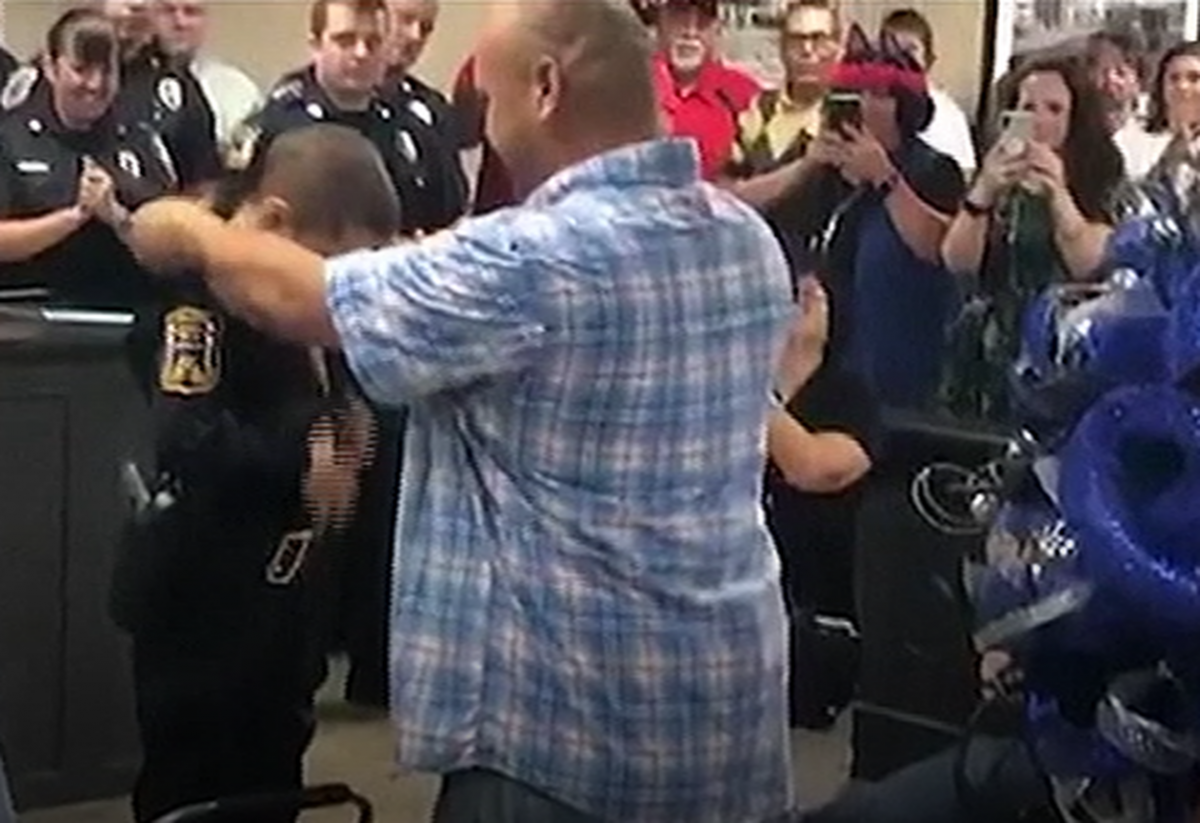 Ο αξιωματικός που την όρκισε αστυνομικό δεν κατάφερε να συγκρατήσει τα δάκρυά του κατά την τελετή, ενώ το κοινό παρακολουθούσε εξίσου συγκινημένο.