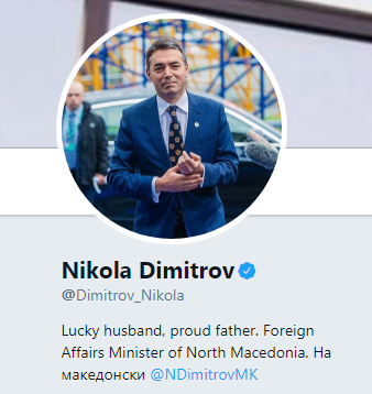 Ο κ. Ντιμιτρόφ εμφανίζεται πλέον, στο προφίλ του στο τουίτερ, ως υπουργός Εξωτερικών της Βόρειας Μακεδονίας.