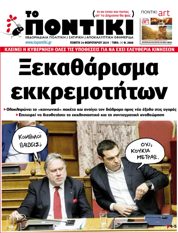 Με πρωτοσέλιδο τίτλο «Ξεκαθάρισμα εκκρεμοτήτων» και αναλυτικό-αποκαλυπτικό ρεπορτάζ για το πώς η κυβέρνηση κλείνει όλες τις υποθέσεις για να έχει ελευθερία κινήσεων και για το πώς ολοκληρώνει το «κοινωνικό» πακέτο και ανοίγει το δρόμο για νέα έξοδο στις αγορές, ενώ επιχειρεί να διευθετήσει το εκκλησιαστικό και τη συνταγματική αναθεώρηση, κυκλοφορεί το «ΠΟΝΤΙΚΙ» το πρωί της Πέμπτης.